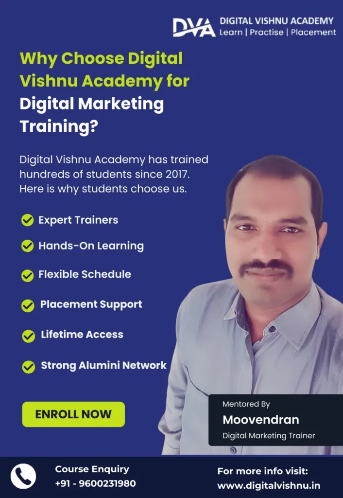 Digital Vishnu Academy also provides one-on-one training for students who need extra guidance. Our team answers all your questions and supports you throughout the learning journey. You can join our offline digital marketing course in Coimbatore if you prefer classroom learning, or choose online classes if you want flexibility.