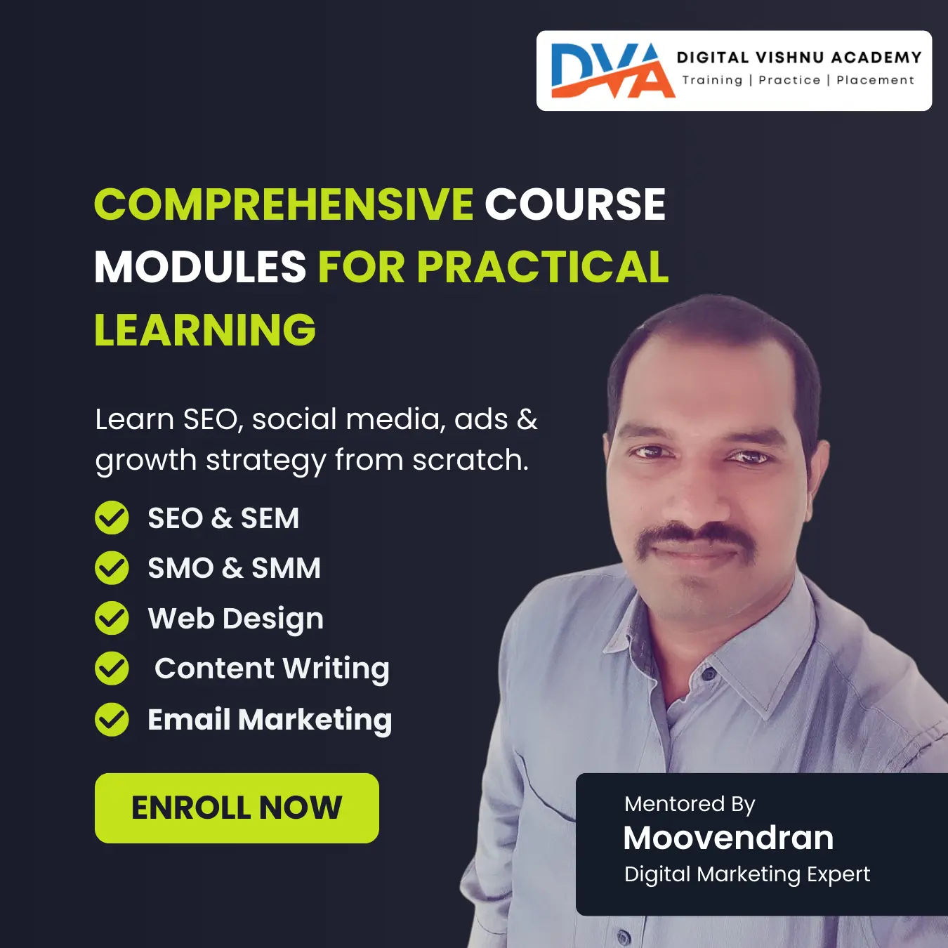 Digital Vishnu Academy is a great option for learning digital marketing in Coimbatore. It offers affordable fees, expert trainers, and practical training that helps you learn by doing. They also teach every module with live projects and provide internship program, making it easier to find a job after completing the course. This course is perfect for beginners who are just starting out, professionals who want to improve their skills, and business owners who want to grow their online presence. Whether you’re starting your career or looking to advance it, Digital Vishnu Academy is a smart choice!