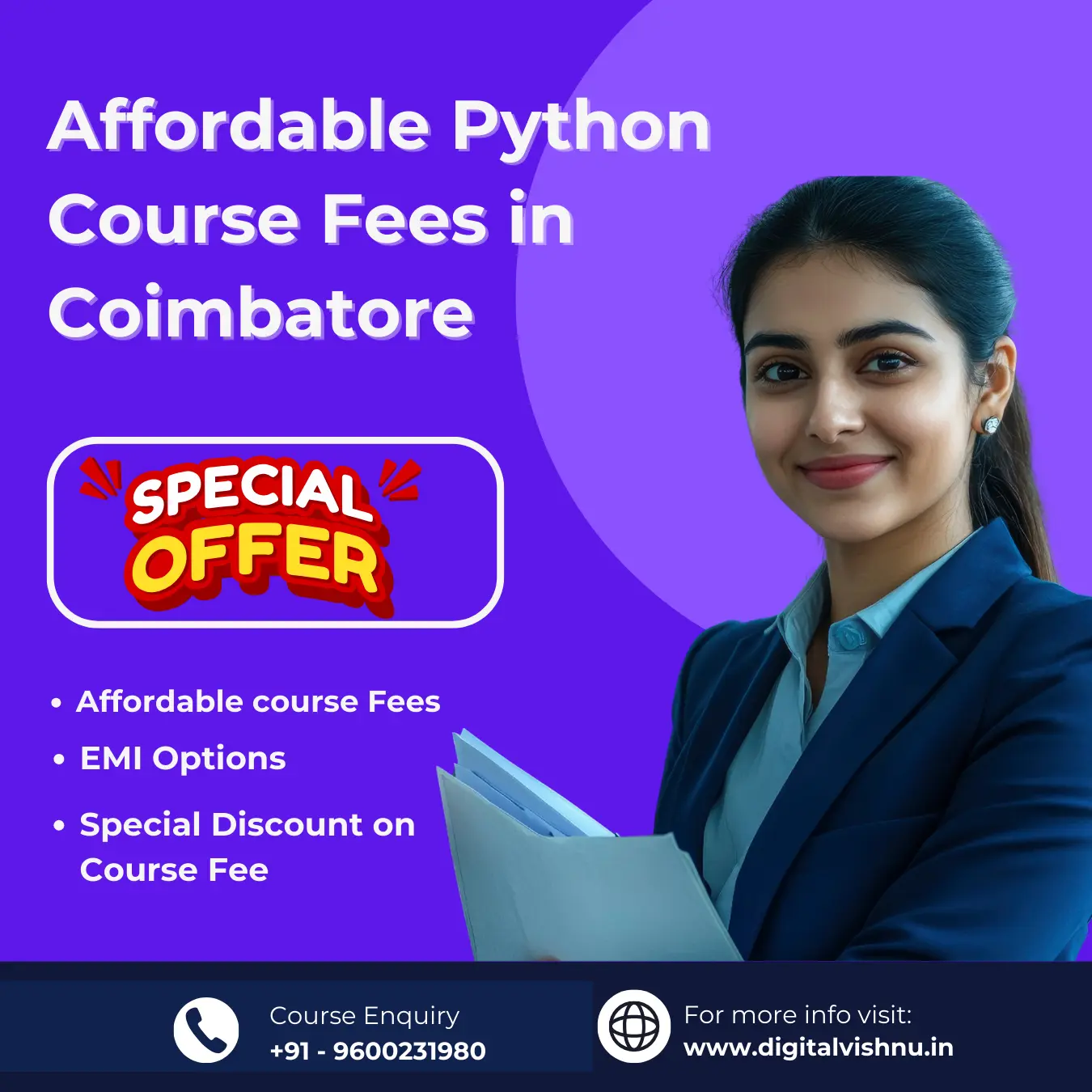 The python course fee in Coimbatore at Digital Vishnu Academy is competitively priced and includes all training materials, certification, and placement support without hidden charges. We offer flexible payment options including monthly installments for students and professionals who want to learn without financial stress.
