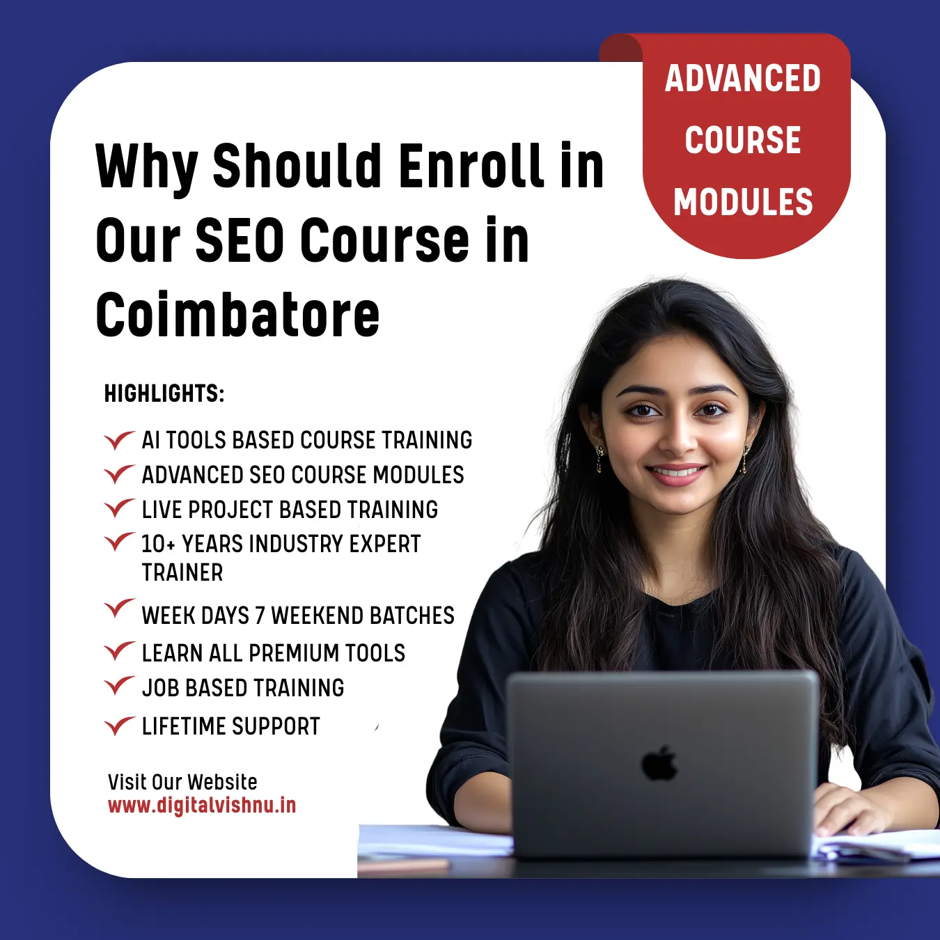 Are you looking for the best SEO course in Coimbatore that helps you build a successful digital marketing career? Digital Vishnu Academy offers hands-on SEO training designed for college students, business owners, job seekers, career changers, IT professionals, and housewives. Our SEO course in Coimbatore focuses on real-world skills, live projects, and guaranteed placement support to help you grow professionally.